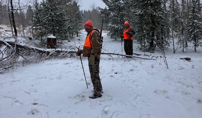 Morning brought a fresh blanket of snow, cold air, and high spirits. We scattered across the mountain, but despite the ideal conditions, no elk tracks appeared. Dan the Man hiked 18 miles, while others covered at least eight, battling snow and wind. Chipmunks and pines were all we found. Exhausted, we gathered in the garage that night, sharing solo cups of bourbon and makeshift meals. Jon’s warmth and Danny’s tales broke the ice, knitting our ragtag crew closer.
